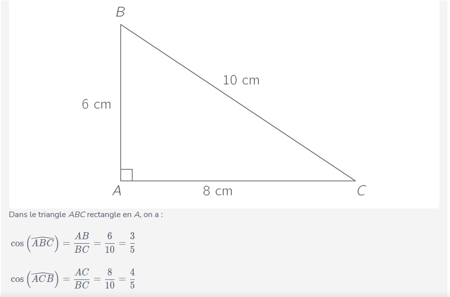 - le cosinus d'un angle aigu est toujours compris entre 0 et 1.