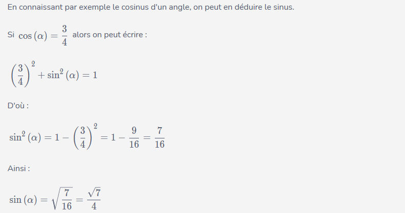 On peut alors calculer le sinus d'un angle connaissant le cosinus, et inversement.